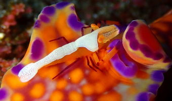 数日前からニシキウミウシに乗ってるウミウシカクレエビが登場しています!