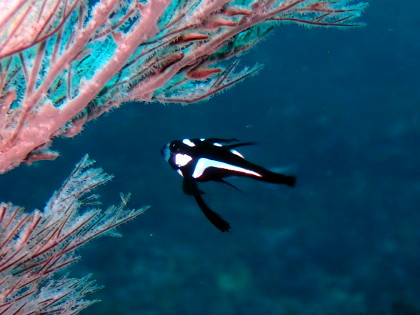 ミツボシクロスズメダイの群れにフタスジリュウキュウスズメダイがいました。