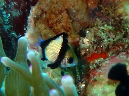 沢山のミツボシクロスズメダイ↑に混じってフタスジリュウキュウスズメダイ↓が1尾だけいました。